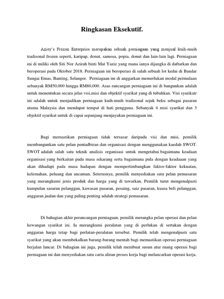 Contoh Ringkasan Eksekutif : Proposal Bisnis Plan Relarindu Choco Drink By End Wahyu 007 Surakarta Ringkasan Eksekutif Pendidikan Islam Iain Islam Iain Surakarta Pubhtml5. Rencana pendirian usaha bostea adalah perencanaan usaha dengan melakukan modifikasi terhadap salah satu makanan hidangan meja saat . Ringkasan eksekutif ini memiliki fungsi agar pembaca dalam hal ini calon mitra tertarik dengan proposal bisnis yang kawan kledo tulis. Contoh ringkasan eksekutif bisnis plan makanan atau biasa disebut executive summary. Namun di luar itu semua ada bagian yang sangat penting yang harus ada di dalam proposal bisnis yaitu executive summary atau contoh ringkasan . Ini adalah contoh ringkasan eksekutif bisnis plan makanan kedai kentang goreng. Ringkasan eksekutif adalah salah satu bagian dari rencana bisnis atau bisnis plan.